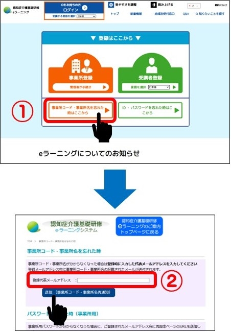 - ①Click on "If you forget your establishment code or name, click here" on the top page.